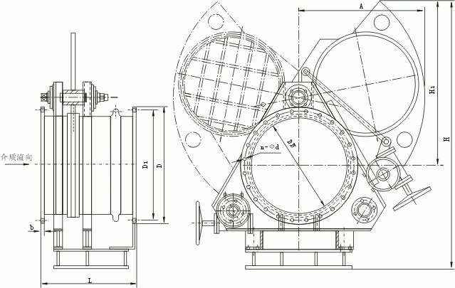 F343CX蜗轮扇形眼镜阀又称蜗轮扇形盲板阀,蜗轮翻板阀,蜗轮扇形阀,由左阀体、中阀体、右阀体、扇形盲板、丝杆螺母、不锈钢补偿器、两个蜗轮传动机构等组成。它是通过三根丝杆连成一体,并把三个阀体分别固定在底座上,构成一个刚性结构体。中阀体与右阀体用不锈钢膨胀管连接,左、中阀体分别用三根两端带左右梯形螺纹的丝杆连接,将三根丝杆同时作正向(或反向)旋转,则左、中两阀体得到压紧(或分离)。三根丝杆中上面一根丝杠中间装有盲板,盲板绕该轴心旋转。下面两根丝杆在同样的部位上安装有盲板的定位块,盲板旋转时可以防止盲板漂移,避免密封圈擦伤,其中一根丝杆上装有蜗轮传动机构,实现松开夹紧阀体的目的。